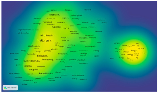 Co-citation density (Every data point (author) is assigned a colour based on the concentration “number of cited papers per author”. These colours serve as indicators of the density, ranging from yellow denoting higher density and blue indicating lower density). Visualisation of highly cited authors in LCA publications (1992–2022).