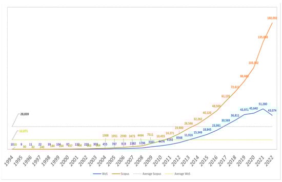 Over the past 3 years, the total number of publications has demonstrated a consistent growth trend, with an average of 2565 publications per year. However, in 2022, a minor decrease was observed in the overall number of publications across both databases, compared to the count recorded in 2021. It is worth noting that this decrease could be attributed to disparities in publication years, as outlined in Section 3.1. Specifically, the publications indexed in the first month of 2023, which account for 495 records, could pertain to the year 2022.