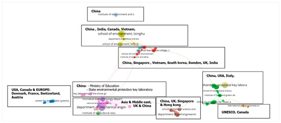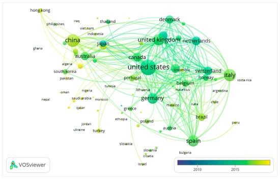Since 2008, there has been a significant growth in LCA publications in both the United States and China. However, China has shown the most substantial growth rate since 2016 and is expected to surpass the US in the near future to become the most productive country in this area [44]. This broadly coincides with the conclusions drawn from various studies [90,91] regarding China’s outstanding performance in terms of the quantity of indexed publications, particularly those indexed in SCI/SSCI. An overlay visualisation of co-authorship countries between 1992 and 2022 as presented in Figure 6 (The colour of a term indicates the average timeline of the total publications by country. The more prolific country and institute are based on the author’s country affiliation), highlights the productivity of various countries in the LCA field. The USA, with 3263 publications (12.61%), is the most productive country, followed by China with 2262 publications (8.95%) and Italy with 2056 publications (6.93%). In terms of the TC indicator, the USA ranks first, followed by the UK, Italy, and China.