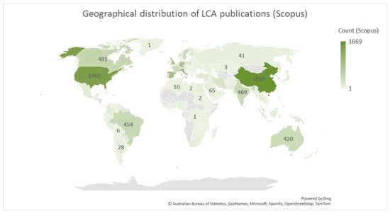 Table 3 presents an overview of the linguistic composition of LCA publications during the time periods of 1992–2018 and 2019–2022. The dominant language of LCA literature in both databases is English. Specifically, in the period of 1992–2018, a total of 11,632 LCA publications in English, accounting for 96% of the total relevant records in Scopus. Chinese is the second most prevalent language in Scopus with 320 articles (2%), followed by German and Spanish. In the period of 2019–2022, a total of 8003 LCA publications in English were recorded, representing 99% of the total records in Scopus. Chinese is once again the second most frequently used language, accounting for 71 articles (1%), followed by Spanish and Portuguese. The extant literature suggests that even in several countries where English is not the primary language, such as China, Japan, and Germany, the use of English in LCA contexts is prevalent.