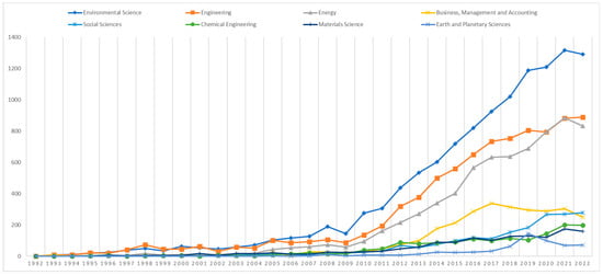According to Chen et al. [41], the number of LCA publications in WoS has experienced a notable increase, rising from 98 total publications in 1998 to 1313 total publications in 2013. The annual growth rate of LCA publications has averaged between 100 and 150 publications since 2008, as reported by Hou et al. [43]. As shown in Figure 2, the evolutionary pattern of published literature in Scopus since 1991 indicates an exponential growth trend.
