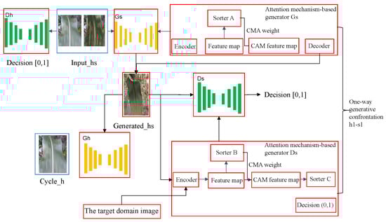 The discriminator incorporates the soft attention mechanism module of CAM. As illustrated in Figure 3b, the discriminator receives input images from both the generated image and the target domain images Y. The discriminator is equipped with two binary classifiers: classifier B and classifier C. Classifier B determines whether the input image is a generated image or an image from the target domain by processing the feature maps that are extracted from the input-generated image and the target domain image, both encoded by the discriminator . The output of classifier B is the probability of the input image being a generated image. Classifier C, on the other hand, determines the same by processing the attention mechanism feature map generated via CAM. This feature map is obtained from the input-generated image and the target domain image after being processed by CAM. The output of classifier C also represents the probability of the input image being a generated image. Both classifiers B and C aim to determine whether the input image originates from a generated image or an image from the target domain.