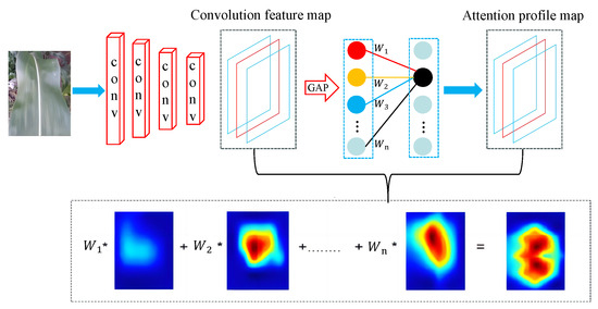 The attention mechanism employed in the generator and discriminator is the class activation map (CAM) soft attention method. This method calculates the spatial average values of individual neurons from the feature maps obtained through convolution and global average pooling. These average values are then linearly weighted to generate the required class activation map. The localization of CAM within the image is achieved by utilizing category information and weight information specific to the image. Upsampling CAM produces a feature map of the same size as the input image, determining the position region relevant to the label category. The calculation of the CAM feature map adopts a global approach, encompassing the entire feature map. The generation process based on the CAM attention feature map is illustrated in Figure 2.