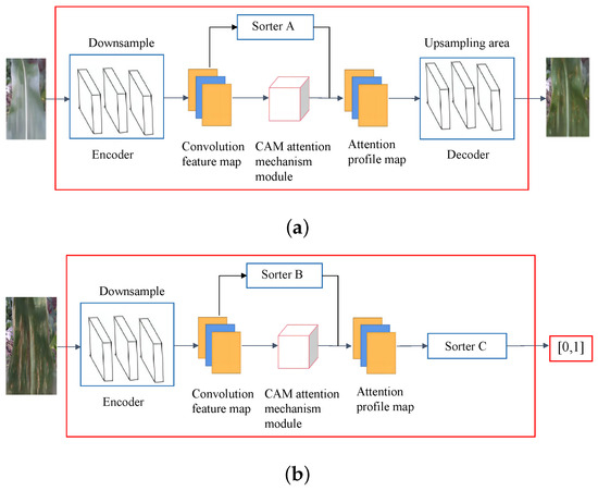 The input of the discriminator consists of both real maize disease leaf images and generated ones. Following downsampling by the encoder, the input undergoes one-dimensional convolution, combined with a bias vector, and is subsequently passed through a sigmoid function to accomplish the binary classification task utilizing probability values. A discriminator output value of 1 signifies the identification of the input maize disease image as real, while a value of 0 denotes the classification of the maize disease image as generated. Figure 3b displays the network structure of the discriminator after integrating the CAM soft attention mechanism module into the original model.