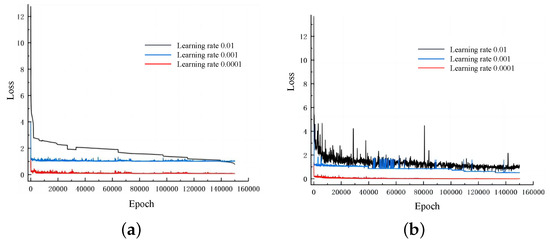 The impact of different learning rates on the loss function is analyzed, as depicted in Figure 4a. It is observed that the loss function decreases relatively smoothly after 15,000 epochs with a learning rate of 0.001. The value of the loss function is lower than those corresponding to the learning rates 0.01 and 0.0001, suggesting that a learning rate of 0.001 is optimal for training the model. Figure 4b reveals that the loss function value exhibits relatively large fluctuations when the learning rate is set to 0.01 and 0.0001. Initially, the loss function value experiences instability but later stabilizes. However, when the learning rate is set to 0.001, the overall decrease in the loss function is similarly smooth. This learning rate also yields the optimal value for the loss function among the three learning rates considered. Based on an analysis of the training and testing loss values, it is concluded that the optimal initial learning rate for the model is 0.001. The comparison of learning rate experiments revealed that beyond 80,000 rounds, the rate of decrease becomes insignificant, and this decrease can be disregarded. Consequently, it is determined that the appropriate number of training iterations is 80,000 rounds.
