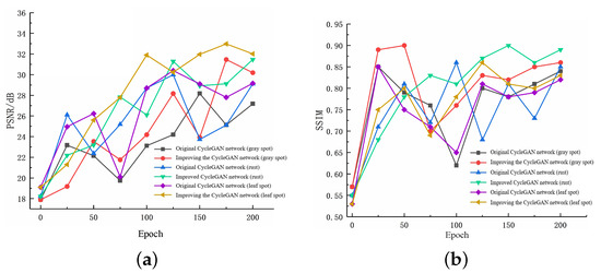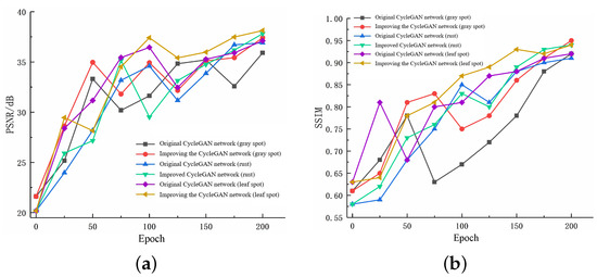 Comparison of the original and improved networks that generated leaf images of minor maize disease: (a) the change in PSNR value, (b) the change in PSNR value.