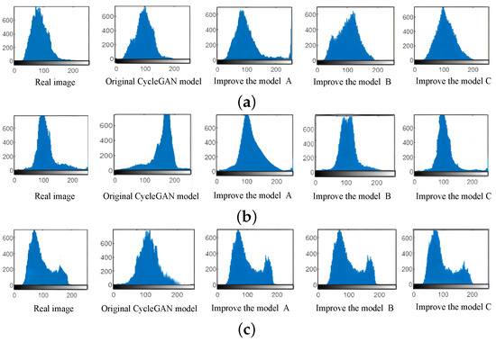 The gray-level histogram is a statistical function that represents the distribution of gray levels in an image. It shows the frequency of occurrence of different gray levels by indicating the number of pixels with a specific gray level. Figure 7 presents the comparison of gray-level histograms for the target images generated from real images, the original CycleGAN model, and improved models A, B, and C. The horizontal axis represents the pixel value, and the vertical axis represents the number of pixels. This comparison provides insight into the variations in gray-level distributions among the different image generation models.