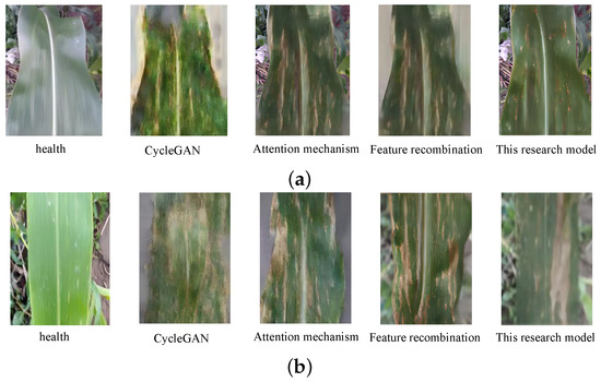 In this study, we improved CycleGAN by incorporating an attention mechanism module and a feature recombination loss function, thereby constructing a model for transforming maize disease leaf images. We examined the impact of different mechanisms on the enhanced CycleGAN model and evaluated the quality of generated maize gray leaf spot disease images under varying levels of background complexity. Comparative experiments were conducted through ablation experiments with traditional models. Finally, we compared the accuracy of different methods using a classification model to validate the effectiveness of the model.