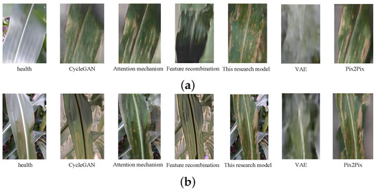 - Comparative experiments were conducted through ablation experiments with the traditional generation models VAE and Pix2Pix. Maize gray leaf spot disease was taken as the experimental object, and the generated image quality was compared under different background complexity levels. The results showed that compared to the original CycleGAN method, the attention-based CycleGAN method, and the feature recombination-based CycleGAN method, the proposed method in this paper had obvious improvements. Compared with the traditional generation models VAE and Pix2Pix, this proposed method not only enhanced the overall clarity of the images, but also realized the generation of maize disease feature information in specific regions, and the edge information of the generated images was also closer to the original images.