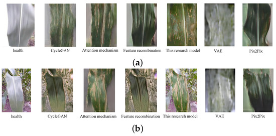 - In the experiments, to test the influence of the improved methods on the model performance, both the original CycleGAN model and the improved CycleGAN model were used to perform disease transfer on healthy maize leaves. Overall, compared to the original CycleGAN model, the improved CycleGAN model proposed in this study achieved improvements in the PSNR and SSIM values of the three different disease severity diseases, indicating better image quality of the generated images.
