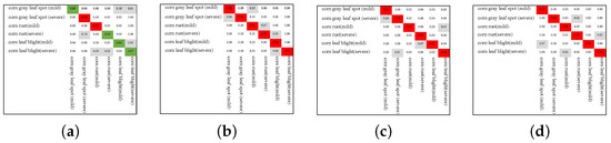 Based on Table 5, the proposed improved model achieves the highest accuracy among the six classification models when generating the augmented dataset. Notably, the average accuracy using the GoogLeNet model reaches up to 93.64%, surpassing the accuracy of the original dataset, original model, and datasets expanded by deep learning generation models. For the classification results of VGG16, ResNet50, DenseNet50, and GoogLeNet, confusion matrices are presented in Figure 11, Figure 12, Figure 13 and Figure 14. In these figures, (a) represents the original dataset, (b) represents the CycleGAN model augmented dataset, (c) corresponds to the augmented dataset using the improved model from this paper, and (d) signifies the Pix2Pix model augmented dataset.