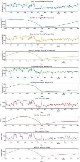 Figure 3 provides valuable insights into the daily and monthly trends of all features. The bearing shaft temperature exhibits a peak from May to mid-September, followed by a decline in October. This temperature pattern can be attributed to higher ambient temperatures and increased solar radiation during the summer months. These factors can contribute to elevated temperatures in various wind turbine components, including the bearing shaft. Elevated temperatures can lead to increased friction and heat generation within the bearings, resulting in higher temperatures. As the weather cools down in October, ambient temperatures decrease, leading to a reduction in bearing temperatures. This trend is consistent with most other features, as highly correlated attributes were considered during the model’s development.