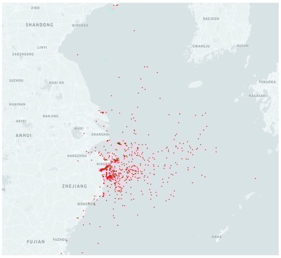This study developed a comprehensive and robust five-year (2018–2022) fishing vessel accident database for the Ningbo region, China, sourcing diverse data on accidents including date, location, vessel information (operational mode, age, material, dimensions, tonnage, and power), accident type, personnel and vessel certifications, casualties, losses, and brief descriptions of accident causation. Some accident reports provide environmental conditions, but the details vary. Vessel data was sourced by referencing the fishery system using the Maritime Mobile Service Identity (MMSI) and Beidou ID. Environmental data gaps were addressed via retrospective marine meteorological assessments. This rigorous data collection approach culminated in 3448 accident samples, methodically organized in an Excel framework, archiving pertinent details derived from accident reports. Figure 1 illustrates the spatial distribution of these accidents with locations indicated by red dots.