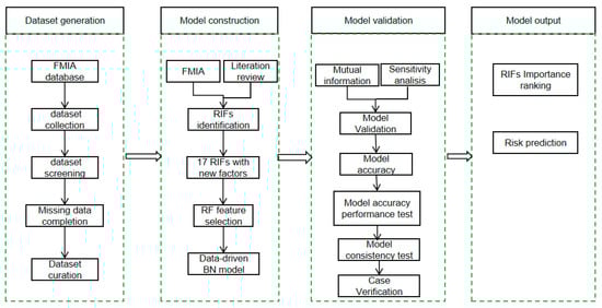 This study first utilizes the random forest algorithm to evaluate and rank the importance of risk influential factors (RIFs). The paramount RIFs were then chosen to construct a Bayesian model, employing the tree-augmented naive Bayes (TAN) classifier specifically. After model construction, sensitivity analysis, validation, and performance assessment were conducted, as depicted in Figure 2.