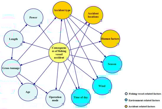 Environmental factors also play a crucial role in fishing vessel accidents. Several studies have cited adverse weather conditions as a key cause of fishing vessel accidents, often exceeding human error [,]. Studies by Jin et al. [,], Davis et al. [], Heij and Knapp [], Weng et al. [], and others have identified correlations between adverse weather conditions, seasons, and the occurrence and severity of accidents. By employing advanced machine learning methods, Rezaee et al. [], Liu et al. [], and Wang et al. [] further clarified the relationship between weather conditions and accident severity. Özaydın et al. [] used BN and association rule mining (ARM) methods to demonstrate the impact of adverse weather and sea conditions on fishing vessel accidents.