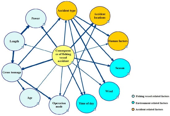 To create a purely data-driven model, the tree-augmented naive Bayes (TAN) [,] approach was employed for training without integrating prior knowledge. The final training outcomes are depicted in Figure 3. The trained BN structure consists of 12 nodes interconnected by 21 links. Nodes highlighted in light blue represent vessel-related factors; those in orange correspond to accident-related factors; and the ones in bright blue signify environment-related factors. Links were established by examining the correlations among all influencing factors as per accident records.