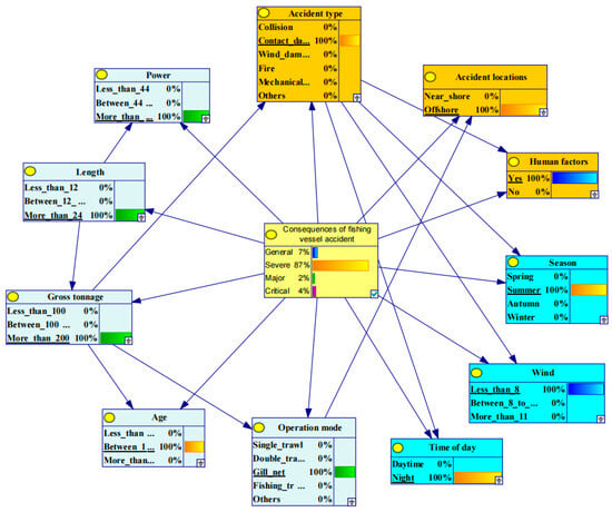 The three identified environmental factors include wind, time of day, and season. Prior studies [,] have substantiated the significance of wind as an influencing factor on the consequences, which aligns with our findings. Similarly, the season is a pivotal factor affecting accident severity, consistent with previous research []. The probability of accidents happening in the summer is the lowest, reflecting reality as the study area has a fishing ban from 1st May to 17th September, resulting in fewer active fishing vessels and, hence, a lower accident probability. Additionally, the time of day significantly impacts accidents and emerges as one of the most influential factors, consistent with previous research. Numerous researchers, including Jin et al. [], have indicated that fatal fishing vessel accidents are more likely to occur at night. The increased probability of severe accidents during nighttime might be attributed to the challenge sailors face in judging distances and estimating visibility at night, leading to heightened confusion as visibility naturally diminishes.