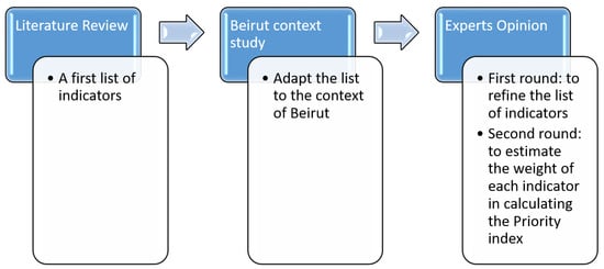 The first list of indicators was proposed to 33 experts in Lebanon. Then, it was updated and reduced to 12 indicators that were classified into two categories: buildings’ physical characteristics and socio-economic indicators. The final list of indicators is presented in Table 1.