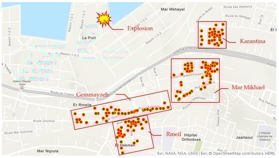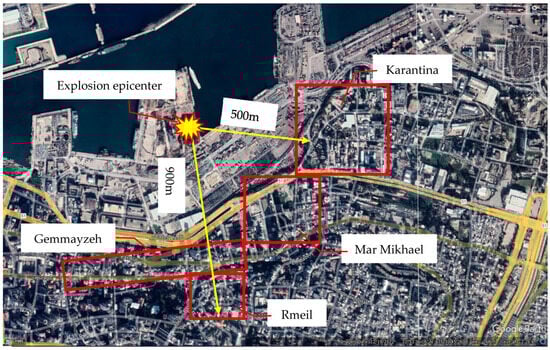 On the 4th of August 2020, the massive explosion at the port of Beirut resulted in the loss of more than 200 lives and more than 6500 injuries. The explosion left about 300,000 people homeless, and approximately 25,000 buildings were affected, varying from minor damage to total collapse. The massive destruction resulted in a national and international wave of solidarity. However, the coordination among the stakeholders and the management of the process was often ineffective, which led to conflicts between owners, organizations, donors, and public authorities, as well as to redundancy and duplication in the renovation process. The continued presence of a significant number of damaged buildings, even after nearly three years since the explosion, serves as tangible evidence highlighting the significance and relevance of this research. The study area is limited to four of the most damaged zones near the explosion’s epicenter (Figure 2). It includes around 300 buildings with various architectural and structural types. The distance between the epicenter and the study area ranges from 500 m to 900 m.