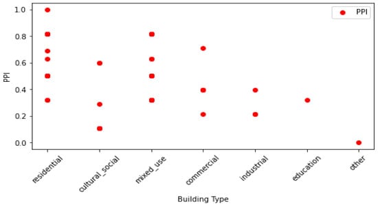 - The final step was to multiply each indicator by its weight and sum the results for each building to obtain the PPI and SEPI, as in Equations (A2) and (A3).