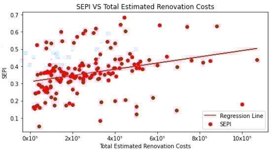 Distribution of buildings’ estimated renovation costs across the assessed buildings.