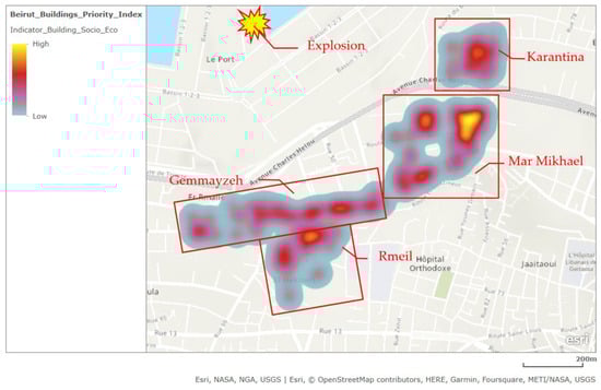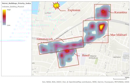 Beirut is the capital of Lebanon, has existed for millennia, and is located across the Mediterranean Sea coast. The Lebanon Crisis Response Plan data estimate Beirut’s total population at 1,291,280 [28], with a total area of 146 km2. Beirut has rich culture and history that can be observed in the city’s urban pattern, architectural expressions, and sociocultural fabric. However, it is marked by significant socioeconomic inequalities, with compounded crises from the financial collapse, the COVID-19 pandemic, and the explosion causing adverse effects on its economic activity and individuals’ livelihoods. Poverty levels in Lebanon have rapidly risen, with estimates revealing that over 55 percent of the country’s population were trapped in poverty in 2020 [29]. The current situation is characterized by depleted business activities, high unemployment rates, food insecurity, and increased poverty [28]. Moreover, Beirut City suffered from decades of civil unrest, conflict, underinvestment, lack of reliable data, unmanaged city growth, and poor governance [28]. According to [30], during the Lebanese civil war (1975–1990), building construction was affected by poor building code design provisions and a lack of material quality control. Despite being an area of moderate seismicity, most of the buildings in Beirut were designed to resist gravity loads only during that era, with little or no consideration for lateral loads. Seismic standards were introduced in the 1990s. However, they were not strictly enforced until 2013. Beirut also faces vacancies in building units because of factors such as unaffordability, real estate development, inappropriate land use, and urban planning policies.