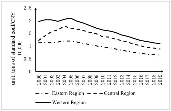 Eastern China includes 10 provinces, autonomous regions, and municipalities directly under the central government, namely Beijing, Tianjin, Hebei, Shanghai, Jiangsu, Zhejiang, Fujian, Shandong, Guangdong, and Hainan. Central China includes 10 provinces and autonomous regions, namely Shanxi, Inner Mongolia, Jilin, Heilongjiang, Liaoning, Anhui, Jiangxi, Henan, Hubei, and Hunan. The western region of China includes 10 provinces, autonomous regions, and municipalities, namely Sichuan, Chongqing, Guizhou, Yunnan, Guangxi, Shaanxi, Gansu, Ningxia, Qinghai, and Xinjiang. The study area can be seen in the map in the Appendix A. Figure 1 demonstrates that the energy intensity of all regions in China shows an overall decreasing trend, while the central region showed an increasing trend from 2000 to 2004. The energy intensity of the western region was higher than that of the central region and eastern region. In China, there were energy shortages in 2004, and many provinces experienced an energy crisis characterized by electricity, coal, and oil shortages. Afterwards, faced with the above energy dilemma, the regions concerned became more economical in industrial electricity consumption.