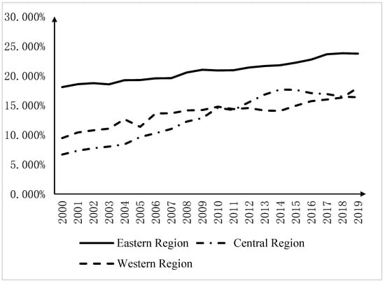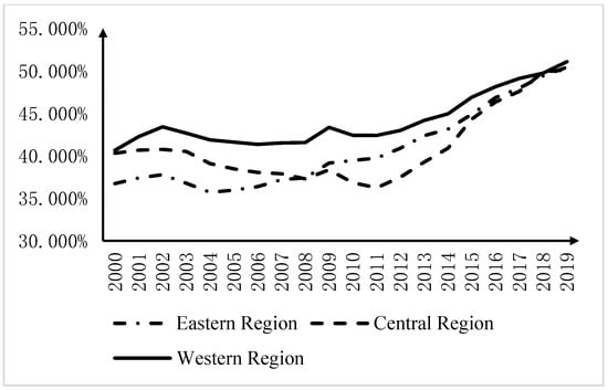 All three regions of China showed a trend of energy consumption transition to the service sector, and the eastern region had the highest share of energy consumption in the service sector (Figure 2). The eastern and western regions showed an upward trend in real value added, and the central region showed a small downward trend until 2011, after which it rose rapidly (Figure 3). By 2019, the share of real value added in services exceeded 50% in all three regions. The eastern region had the highest increase in the real value-added share.