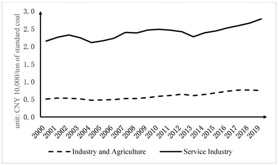 According to Equation (8) , it is shown that a rise in industrial and agricultural energy productivity leads to a rise in total energy productivity. This is because the rise in the energy productivity of industry and agriculture, on the one hand, increases the overall energy productivity through a direct effect. On the other hand, it increases the share of energy consumption in the service sector through an indirect effect. Because the energy productivity of the service sector is higher than that of industry and agriculture, it increases the overall energy productivity as a result. The sign of the equation cannot be determined. From the equation, the first term on the right side of the equation is positive, while the second term is negative. Theoretically, the increase in energy productivity in the service sector increases the overall energy productivity through a direct effect. On the other hand, it shifts the energy consumption structure to industry and agriculture, which causes the overall energy productivity to decrease through an indirect effect. The additive effect depends on which of the two effects dominates.
