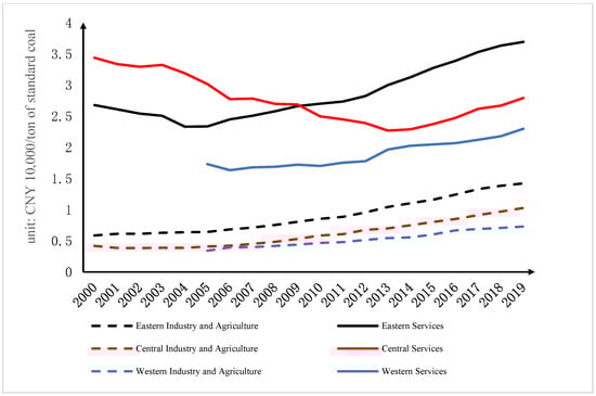 Energy productivity is defined as the ratio of real value added to energy consumption. As can be seen from the data, the energy productivity of the service sector was higher than that of industry and agriculture in all regions of the country (Figure 4). Except for the central region, where energy productivity in the service sector showed a decreasing trend until 2013, energy productivity in all other regions increased. Both industries in the east had higher energy productivity levels than the other regions (Figure 5).