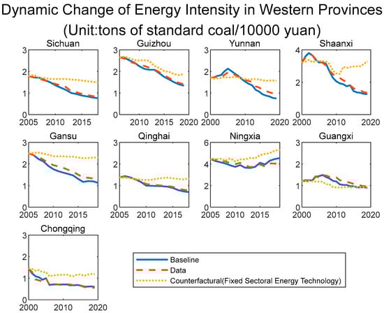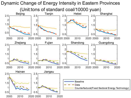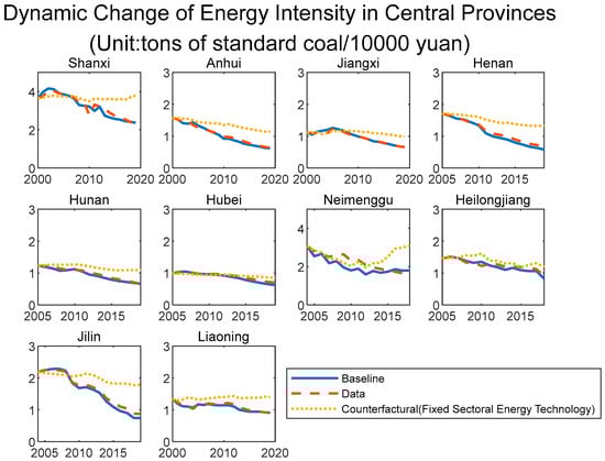 In order to quantitatively study the contribution of the two effects and the relationship between them in different provinces, a counterfactual numerical simulation is used to estimate the energy intensity by fixing the energy technology levels of industry, agriculture, and services in the initial year and re-measuring the summed energy intensity. The principle of counterfactual numerical simulation is to observe the change of energy intensity in the counterfactual case by closing a channel that has an impact on energy intensity (in this study, the technological progress is assumed to remain unchanged).