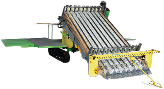 Ortomec Agricultural Equipment Company (USA) has developed a leafy vegetable harvester (In 2011), which mainly includes a cutting device, a conveying device, a cutting height automatic adjustment device, and a collection device. The machine adopted an automatic cutting height adjustment device based on photoelectric sensors, which measures the actual growth height of leafy vegetables and then converts it into a corresponding pulse signal output. The main controller received the output pulse signal and controlled the cutting device to automatically adjust the cutting height but the machine is powered by a diesel engine [20] which causes some pollution to the environment. Figure 1 depicts the SLIDE TW type leafy vegetable harvester created by HORTECH, Italy (In 2016). The machine has a type of corrugated clamping conveyor belt that clamps and moves cut leafy vegetables to the back end for secondary orderly manual bundling. This feature is ideal for leafy vegetables that need to be harvested in an orderly fashion, but it has the drawback that the development of the machine is challenging and difficult to promote to meet the needs of small farmers in terms of production [21]. The SLIDE VALERIANA leafy vegetable harvester (In 2016) is equipped with a soil removal shaker that efficiently removes the clay that adheres to leafy vegetables, resulting in cleaner leafy vegetables collected at the back end. The machine is suitable for harvesting young leafy vegetables [22]. Kawasaki, Japan, has created a wind-fed small leafy vegetable harvester (In 2015) that uses high-pressure airflow to transport cut leafy vegetables to the collection bag at the back end. The benefit of wind-fed conveying is that there is no contact or friction between the cut leafy vegetables and the conveyor belt, which can reduce leafy vegetable damage to some extent and lower the rate of leafy vegetable harvesting damage. The harvesting of small leafy vegetables like clover, chrysanthemum brain, marjoram head, etc., is appropriate for this machine [23]. Figure 2 depicts the TC110E self-propelled leafy vegetable harvester created by Japan Second Industries Co., Ltd. (In 2015). The self-propelled chassis, reciprocating double-action cutter, airflow conveying system, collection bag, etc., are the major components of the machine. Since the cutter and leafy vegetables do not make hard contact during the cutting process, it is possible to guarantee high harvest quality and the basic consistency of leafy vegetable stubble cutting. This machine’s benefits include its great adaptability; capacity to harvest a variety of stemmed leafy vegetables, including sweet potato stem tips; and wide range of cutter height adjustments [24,25].