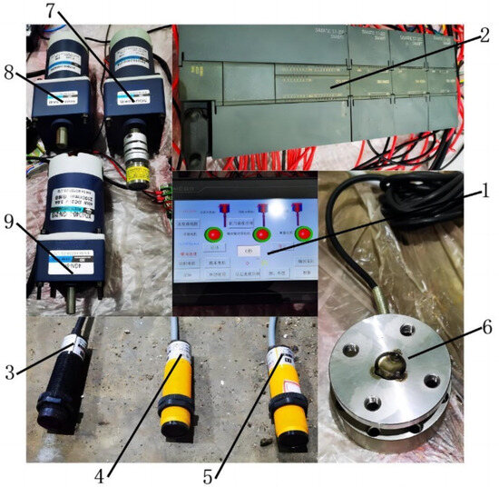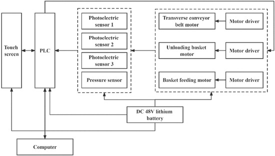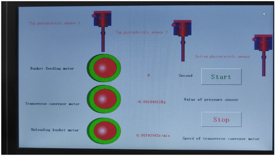 The control system was constructed as shown in Figure 9 with the main components being a touch screen, PLC, photoelectric sensor, pressure sensor, basket unloading motor, basket feeding motor, transverse conveyor belt motor, etc. This was performed to test the stability and accuracy of the control system for the automatic unloading and replenishment of baskets based on the cooperative detection of the photoelectric sensor and pressure sensor. Table 3 displays the characteristics of each functional component.