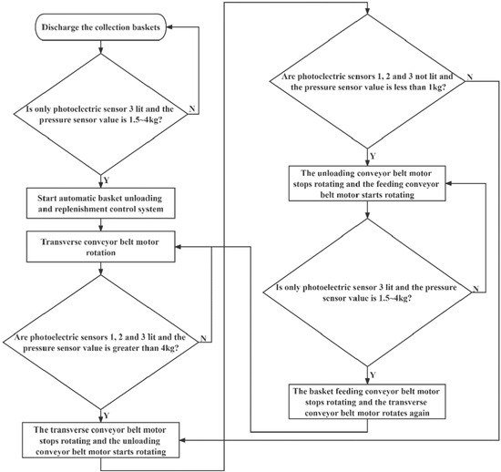 The transverse conveyor belt motor started to rotate and the leafy vegetables began to fall into the collection basket 1 after the collection baskets were discharged. The rotational speed of the transverse conveyor belt motor was adjustable and it lit up on the touch screen when the photoelectric sensor 3 lit up and the pressure sensor value was 1.5~4 kg (adjustable according to the weight of the collection basket). When photoelectric sensors 1, 2, and 3 were on and the pressure sensor value was greater than 4 kg (adjustable according to the type of harvested leafy vegetables), it indicated that the capacity of collection basket 1 had reached the expected capacity, the transverse conveyor belt motor stopped rotating and the unloading basket conveyor belt motor started rotating. When the pressure sensor value was less than 1 kg (adjustable depending on the weight of the collection basket) and none of the photoelectric sensors 1, 2, or 3 lit up, it meant that the collection basket 1 had been unloaded to the ground, the unloading basket conveyor belt motor stopped rotating and the feeding basket conveyor belt motor started rotating. When collection basket 2 (empty basket) was moved to the unloading conveyor belt and the photoelectric sensor 3 lit up once more and the pressure sensor value was 1.5~4 kg, the motor for the feeding basket conveyor belt stopped rotating and the motor for the transverse conveyor belt started rotating once more, realizing the function of automatic basket unloading and basket replenishment in this cycle. The diagram of the automatic basket unloading and basket replenishment control device is shown in Figure 7.