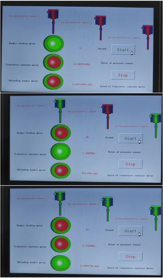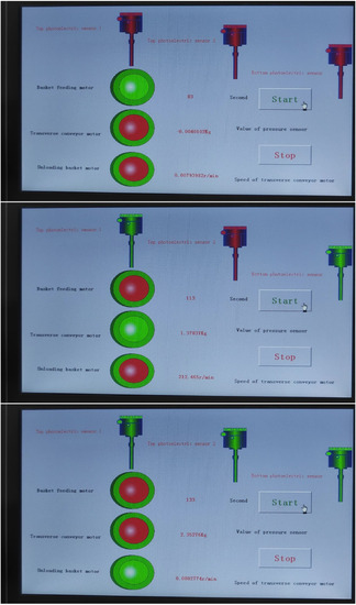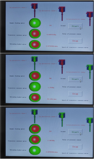 The touchscreen interface of the control system for the automatic unloading and replenishment of baskets was shown in Figure 10. The bottom photoelectric sensor and top photoelectric sensors 1 and 2 on the touch screen were not lit and the pressure sensor value was displayed as −0.00075531 kg, which was roughly similar to 0 kg, after pressing the system start button on the touch screen, as shown in Figure 11. On the touch screen, only the basket feeding motor was on, the transverse conveyor motor and the basket unloading motor were not on, indicating that there was no collection basket on the unloading basket conveyor belt at this time; the basket feeding motor was conveying empty baskets to the unloading basket conveyor belt, extending the basket feeding action for 26 s. At 26 s, on the touch screen only the top photoelectric sensor 2 was not on: the top photoelectric sensor 1 and the bottom photoelectric sensor were on and the pressure sensor value was shown as 1.38488 kg, as shown in Figure 11. Only the transverse conveyor motor lit up on the touch screen, the basket unloading motor and the basket feeding motor did not light up, indicating that the leafy vegetables temporarily stored in the transverse conveyor belt started to fall into the collection basket at this time and had not yet reached the expected capacity of the collection basket, which would continue to extend the leafy vegetable collection action for 17 s. At 43 s, the bottom photoelectric sensor and top photoelectric sensors 1 and 2 were lit on the touch screen and the pressure sensor value was shown as 2.37229 kg, as shown in Figure 11. On the touch screen, only the basket unloading motor lit up, the transverse conveyor motor and the basket feeding motor were not lit up, indicating that the collection basket capacity had reached the expected capacity at this time and the unloading was in progress, extending the unloading action by 40 s. At 83 s, the bottom photoelectric sensor and top photoelectric sensors 1 and 2 were not lit on the touch screen and the pressure sensor value was displayed as −0.0040102 kg, which was approximately equal to 0 kg, as shown in Figure 12. On the touch screen, only the basket feeding motor lit up, the transverse conveyor motor and the basket unloading motor did not light up, indicating that the collection basket with the expected capacity had been unloaded to the ground and the basket feeding motor was transporting empty baskets to the basket unloading conveyor belt to carry out three cycles, simulating the continuous automatic basket unloading and basket replenishment control process of the system. The results are shown in Figure 11, Figure 12 and Figure 13. The system runtime and the operational status or value of each functional component are shown in Table 4. As could be seen from Table 3, the bench simulation tests of the automatic basket unloading and basket replenishment control system based on the photoelectric sensor and pressure sensor cooperative detection control strategy were free of misjudgment and misoperation, which improved the stability, accuracy, and rapidity of the system.