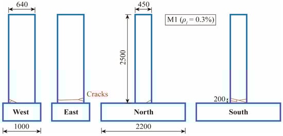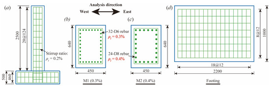 According to the similarity coefficients, the dimensions of the specimens are shown in Figure 1, and each specimen consists of a pier body and a footing at the bottom. The height of the pier body is 2.5 m, and the dimension of the cross-section is 640 × 450 mm, while the height of the footing is 500 mm, and the dimension of its cross-section is 2200 × 1000 mm. The two specimens are only different in the longitudinal reinforcement ratios. In M1, the diameter of the longitudinal rebar is 6 mm, and 32 rebars are placed to achieve a reinforcement ratio of 0.3% (Figure 1b). In M2, the diameter of the longitudinal rebar is 8 mm, and 24 rebars are placed to achieve a reinforcement ratio of 0.4% (Figure 1c). The stirrup ratio is the same as that of the prototype pier; therefore, stirrups with a diameter of 6 mm are placed at a spacing of 124 mm along the pier. The details of the cross-section of the footing are shown in (Figure 1d). The compressive strength of the concrete is found to be 20.1 MPa, based on the compressive testing conducted on concrete cubes of 150 × 150 × 150 mm. The yield strength of the longitudinal reinforcements and the stirrups is 335 MPa, based on the tensile testing. The structural characteristics of the two specimens are listed in Table 1.