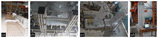 The fabrication process of each specimen consists of the following three primary steps: (1) assembling the reinforcement cage (Figure 2a); (2) placing the wood formwork, and casting the concrete (Figure 2b) (note that the concrete in the pier is cast immediately after the casting of footing is completed to guarantee the structural integrity); (3) removing the formwork when the concrete is fully cured (Figure 2c). Finally, the specimen is moved to the testing area when the fabrication is completed (Figure 2d).