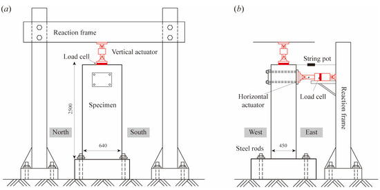 To record the load applied by the vertical actuator, a load cell is placed between the actuator and the top surface of the specimen. The horizontal force is measured with the load cell embedded in the horizontal actuator, while the horizontal displacement is measured with the string potentiometer, with one end being attached to the top of the specimen and the other end being connected to the reaction frame.