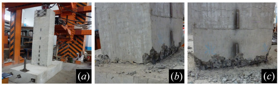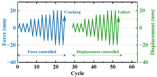 The test setup is shown in Figure 3. After the specimen is moved to the test area, the footing is anchored to the laboratory floor with four steel rods. Two actuators are employed in each test, and each actuator can provide a maximum horizontal loading capacity of 1000 kN and a maximum horizontal displacement of 200 mm. The vertical actuator is installed on the top surface of the specimen, applying a constant axial load to the specimen. According to the axial load on the prototype pier and the similarity coefficients mentioned previously, the axial load is calculated as 57.1 kN (3654/8/8). The horizontal actuator is placed on a steel frame, with one end connected to the pier top, and the other end connected to the steel frame. It applies a horizontal cyclic lateral loading to the top of the specimen. The loading protocol of the horizontal actuator consists of a force-controlled loading phase and a displacement-controlled phase (Figure 4), and this force–displacement hybrid loading protocol has been widely employed in the cyclic quasi-static test to investigate the seismic performance of RC structures [41,42,43]. Each test starts with the force-controlled loading phase. The load level begins from 5 kN, increasing by 5 kN until the concrete cracking is inspected. After that, the loading protocol changes to the displacement-controlled loading phase. The first displacement level is equal to the peak displacement obtained in the last load level of the force-controlled loading phase, and it increases by 5 mm until the specimen is deemed as damaged, which is typically characterized by an 85% reduction of the peak lateral force for the RC piers [44]. Each load level or displacement level contains three push-and-pull cycles. Note that the cyclic loading is applied to the weak axis of the cross-section of the pier body in the west–east direction (Figure 3b).