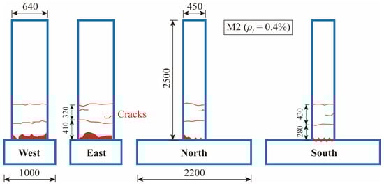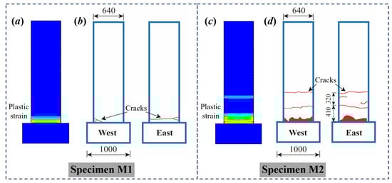 Furthermore, for each specimen, the distribution of the plastic strains of concrete at the failure state is shown in Figure 17. The damages are concentrated within a narrow region at the bottom for specimen M1 (Figure 17a), whereas the damages are located within a wider region for specimen M2 (Figure 17b). As can be seen, the distributions of the plastic strain also coincide with the crack distribution observed from the tests.