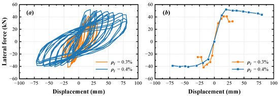 The load–displacement curves and the corresponding backbone curves of the two specimens are compared in Figure 9. As the area enclosed by each hysteretic loop in specimen M2 (blue curve) is larger than that in specimen M1 (orange curve), increasing the longitudinal reinforcement ratio from 0.3% to 0.4% can significantly increase the energy dissipation capacity (Figure 9a). This is due to the fact that the energy is mainly dissipated through the plastic deformation of the reinforcing steels. When the displacement of the pier is the same, the total strain energy dissipated by the reinforcing steels in the pier with a higher reinforcement ratio is greater. According to the skeleton curves shown in Figure 9b, the average of the peak lateral load in specimen M1 is 41.6 kN, while it is 46.6 kN in specimen M2, which is increased by 11.5%, indicating that increasing the reinforcement ratio from 0.3% to 0.4% only slightly increases the peak lateral load. However, it has a significant influence on the failure mode, as specimen M1 (0.3%) fails in the brittle failure mode, while specimen M2 (0.4%) fails in the ductile failure mode.