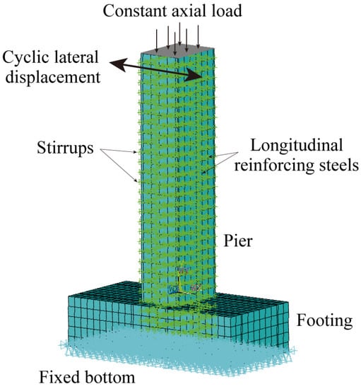 Nonlinear finite element analysis (FEA) was first conducted by Ngo and Scodelis to investigate RC beams [31]. With the rapid advancement of computer technology, finite element analysis has now become a powerful method for evaluating the structural performance of RC bridge piers [32,33,34]. However, finite element analyses are primarily conducted on normal bridge piers (), whereas gravity piers with low reinforcement ratios are rarely investigated. The finite element modeling techniques applied for normal bridge piers may not be appropriate for low-reinforced gravity piers. For instance, the Mander concrete model [35] and the modified Kent–Park concrete model [36] have been widely applied to simulate unconfined and confined concrete in normal RC columns [37,38,39]. However, whether these two concrete constitutive models are still appropriate in simulating low-reinforced gravity piers needs further investigations, as the Mander model was developed based on the investigation of RC columns with reinforcement ratios ranging from 1.6% to 3.2%, while the modified Kent–Park concrete model was developed by investigating RC columns with two reinforcement ratios: 1.79% and 1.86%.