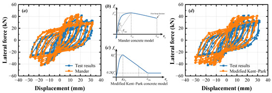 Hysteretic curves obtained with: (a) comparison regarding Mander concrete model; (b) the Mander concrete model;(c) the modified Kent–Park concrete model; (d) comparison regarding the modified Kent–Park concrete model.