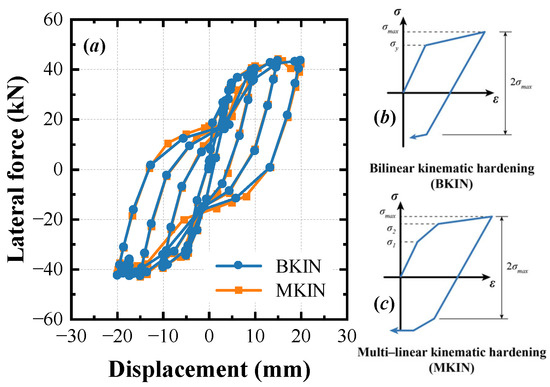 (a) Hysteretic curves obtained with BKIN and MKIN steel models; (b) BKIN model; (c) MKIN model.