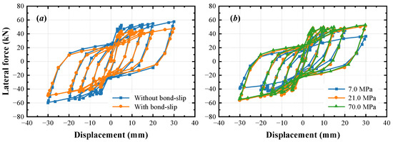 The bond–slip relationship between concrete and reinforcing steel along the longitudinal direction is simulated using the COMBIN39 element, with the equal displacement principle being adopted in the transverse direction. To investigate the influence of the bond–slip behavior on the energy dissipation capacity, two finite element models are built for the M1 specimen. Among them, one model considers the bond–slip behavior, following the elastic–plastic model proposed by Han et al. [52], and the load–displacement relationship is shown by the orange curve in Figure 13a. In this model, the maximum bond stress and the corresponding slip displacement are estimated as 15 MPa and 0.1 mm, respectively. The other finite element model ignores the bond–slip behavior, and the load–displacement relationship is shown by the blue curve in Figure 13a. As can be seen, the bond–slip behavior has a significant influence on the load–displacement hysteretic curve. When the bond–slip behavior is considered, the maximum lateral force and the dissipated energy at each load level are both smaller.