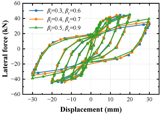 In the SOLID65 element, the cracking behavior of the concrete is affected by two shear transfer coefficients: the open shear transfer coefficient (), and the closed shear transfer coefficient (). To investigate the influence of the shear transfer coefficient on the finite element modeling, three sets of values are selected: (1) and ; (2) and ; (3) and . The load–displacement curves developed with these three sets are compared in Figure 14. It can be seen that the shear transfer coefficient only has a significant influence on the modeling at the failure stage, and increasing the shear transfer coefficient slightly increases the lateral load and the displacement at failure.
