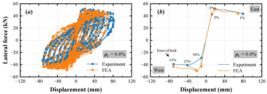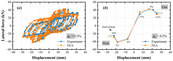 The validation of the finite element modes is conducted by comparing the results obtained from finite element analyses with the test results. For the M1 specimen, the comparisons are shown in Figure 15. At each damage state (cracking, peak, and failure), the error of the lateral loads obtained from the finite element analysis and the test is also shown. Both the load–displacement curves and the backbone curves from the finite element analyses agree well with those from the tests. The brittle failure, which is characterized by a rapid decrease from peak load to failure load, is also presented in the curve from finite element analysis. For the M2 specimen, the comparisons are shown in Figure 16, and the error of the lateral load at each damage state is also shown. In general, the finite element results match the test results, and the ductile behavior is properly presented by the FEA curve. Regarding the comparison of the backbone curves in Figure 16b, good agreement is found on the branch in the east direction. However, for the branch in the west direction, because of the randomness of the concrete material, the test result is asymmetric with that in the east direction, and the agreement is relatively poor.