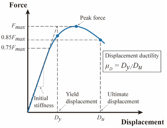 where and are yield and ultimate displacements, respectively. They are obtained from the backbone curves, using the bilinear idealization method proposed by Park [44], as shown in Figure 18. The ultimate displacement is determined at the node when the lateral force drops to 85 percent of the peak force. The yield displacement is determined according to the intersection of two lines: one is the horizontal line connecting to the node of the peak force, and the other is the line connecting the origin point to the node which represents 75 percent of the peak force.