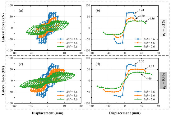 To investigate the influence of the shear span to depth ratio (3.6, 5.6, and 7.6) on the seismic performance, the force–displacement curves and the corresponding backbone curves obtained from finite element analyses for specimens M1 (0.3%) and M2 (0.4%) are shown in Figure 19a,b, respectively. The displacement ductility of each model is also marked near the curve. Note that the ultimate displacement is defined when the lateral force drops to 85% of the peak force, and the results after that are not shown. For both of the reinforcement ratios being considered, with an increase in the shear span to depth ratio, the load–carrying capacity of the pier decreases, but the displacement ductility increases. For instance, for the pier with a 0.3% reinforcement ratio (Figure 19a), when the shear span to depth ratio increases from 3.6 to 7.6, the peak lateral force decreases by approximately 60%, but the displacement ductility increases from 3.44 to 4.36. Furthermore, under the same shear span to depth ratio, increasing the reinforcement ratio increases the displacement ductility. When the shear span to depth ratio is 5.6, the displacement ductility increases from 3.70 to 4.13 with the reinforcement ratio increasing from 0.3% to 0.4%. Thus, it can be inferred that the shear span to depth ratio is inversely correlated with load–carrying capacity, but positively correlated with the displacement capacity.