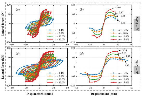 Influence of axial compression ratio on: (a) energy dissipation capacity of M1; (b) backbone curve of M1; (c) energy dissipation capacity of M2; (d) backbone curve of M2.